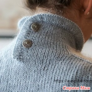 Поднять примерно 112 (116) 120 (124) 128 петель на круговые спицы 4 мм длиной 60/80 см по краю горловины, начиная с последнего поворотного ряда (на разрезе спинки). Вязать лицевой гладью поворотными рядами, выполнив в 1м ряду прибавления следующим образом: 4 лиц, прибавить 1 п (сделать накид, который в след.ряду вы провяжете скрещенной петлей, чтобы избежать дыр), продолжать чередовать 4 лиц/1 накид до конца ряда. Провязать еще 3 лиц.гладью поворотными рядами. Провязать 1 ряд изнаночными, провязать 4 ряда лиц.гладью и закрыть все петли.