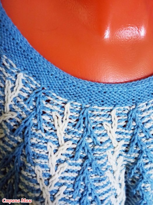 Соответственно и вырез горловины убавила, провязав несколько рядов изнаночной глади. Закрыла, как и автор, полым шнуром.