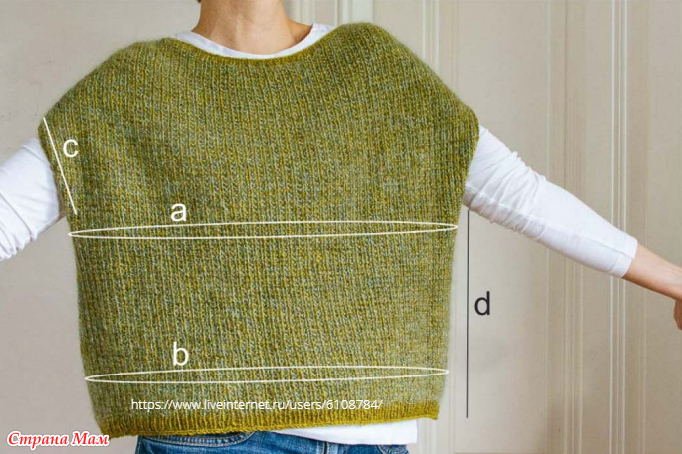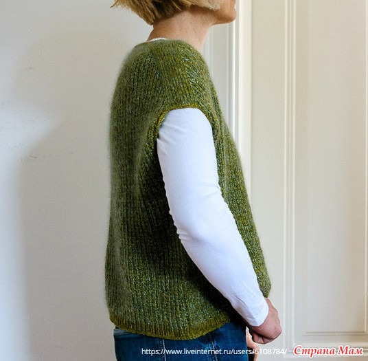 Рекомендуется поместить петли на ненужную пряжу примерить жилет прежде, чем продолжить работу, чтобы убедиться, что длина Вас полностью устраивает.