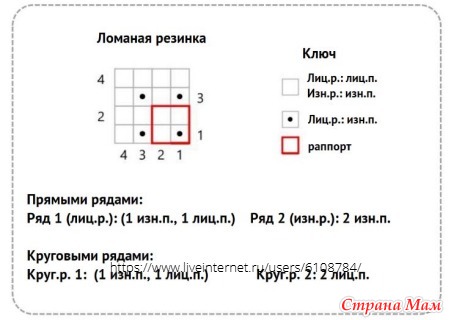 Круг.р. 1 и все круг.р. резинкой должны быть: [(1 изн.п., 1 лиц.п.) до 1 п. перед маркером, 1 изн.п., СМ, лиц.п. до маркера, СМ] 2 раза.