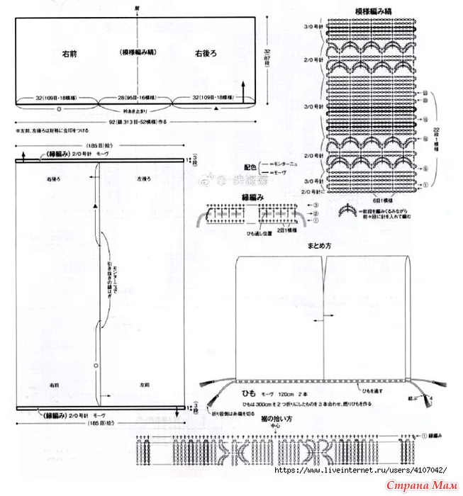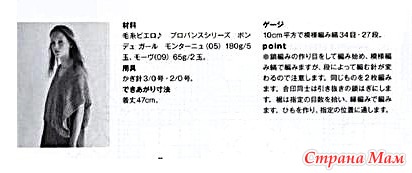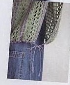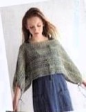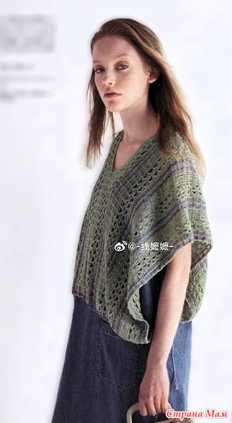 Это простое изделие сшито путем соединения двух кусков прямой вязки. Силуэт меняется, когда вы распускаете завязку по низу и поворачиваете изделие на 90 градусов. Дизайн очарователен, накидка развевается на ветру, а цветовая гамма напоминает лаванду, выстроившуюся в ряд на зеленом поле.