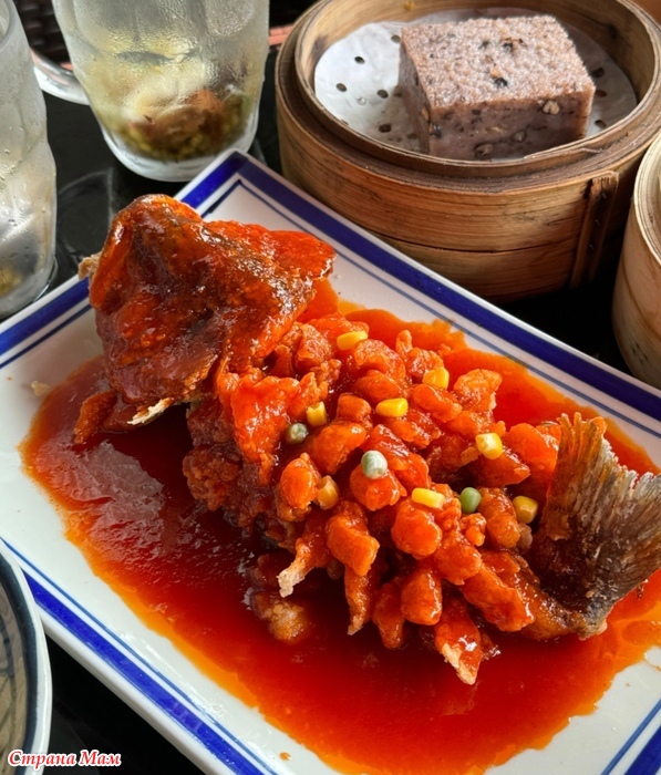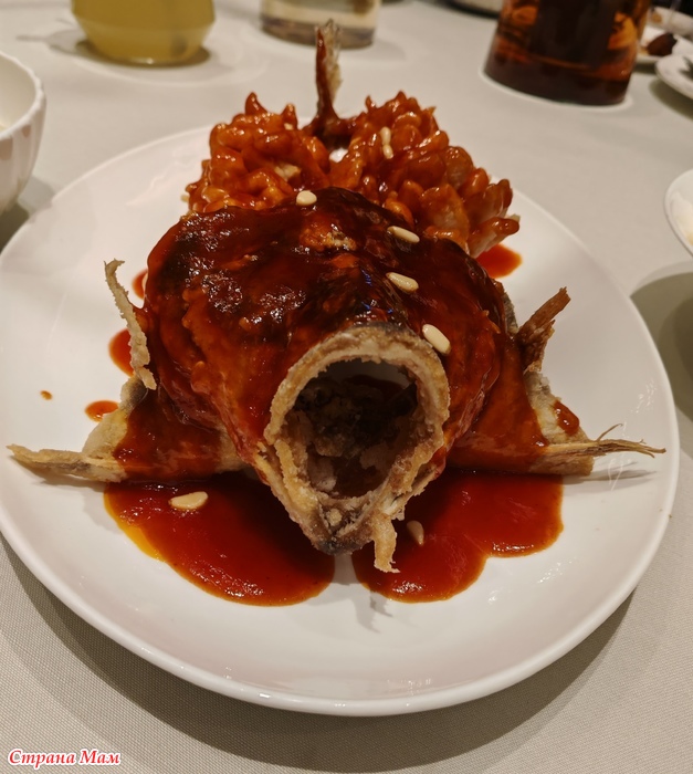 Жареный окунь ауха под кисло-сладким соусом посыпанный кедровыми орешками. Это блюдо довольно часто упоминается в китайских новеллах как "Окунь белка" или "Окунь хризантема"