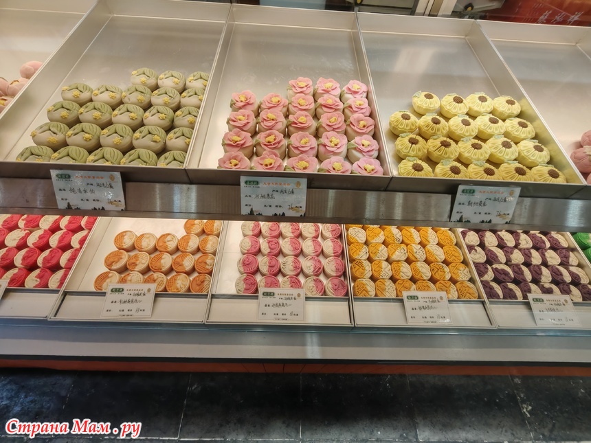 Пирожные с начинкой из красных бобов, зеленого нута, семян лотоса, соли и перца, орехов в карамели, сухого мяса и т. д.