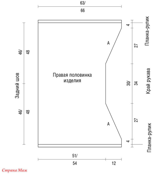 Выполнить задний средний шов длиной 46 (48) cм, включая планку-рулик (на участке планки-рулика шов выполнять с лицевой стороны, чтобы на планке, свернувшейся в рулик, он находился внутри). Аналогично выполнить боковые швы (= A).