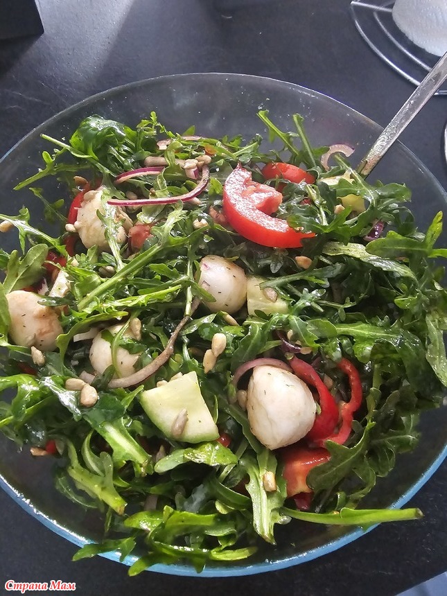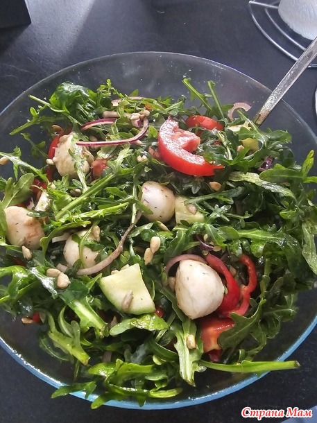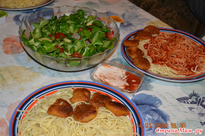 В среду отварила просто спагетти и пожарила куриные наггетсы. И зелёный свежий салат: полевой салат, огурцы, редис, помидорки черри. Заправила растительным маслом.