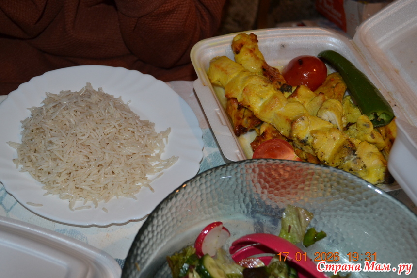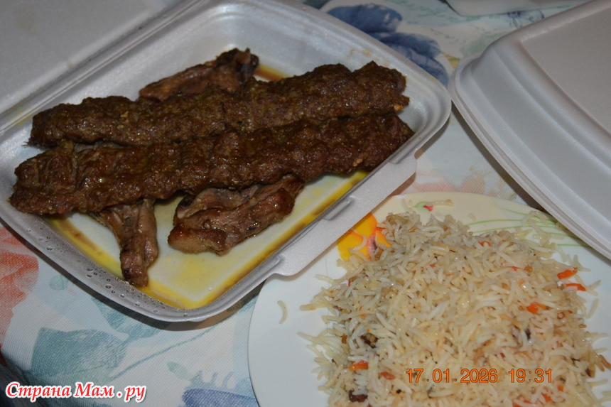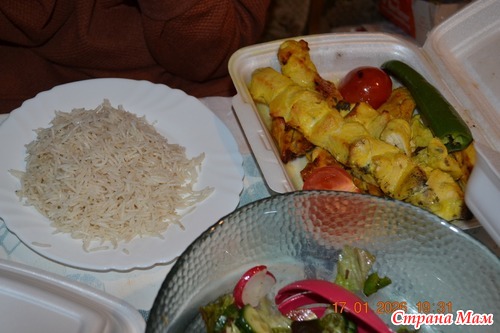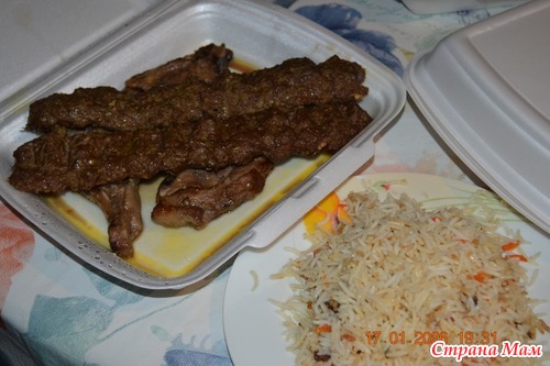 Вчеры мы с детьми затеяли генеральную уборку. Поэтому ничего вообще не варила, у нас тут открылся новый афганский ресторан, и они в честь открытия сделали двухдневную 50%-ную скидку на все блюда из их меню.Послала Мишку с Юлианом, они купили Таблет на 4 персоны. Там был афганский плов с мясом, морковью и изюмом-4 дозы большие, куриный шашлык, кёфте, куриные крылышки и баранина на косточке-всё на гриле пожарено.