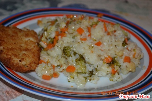 Четверг-рыбный день)) сделала рис ризотто ( с брокколи, цветной капустой и морковью) и запекла в духовке рыбное филе в панировке.
