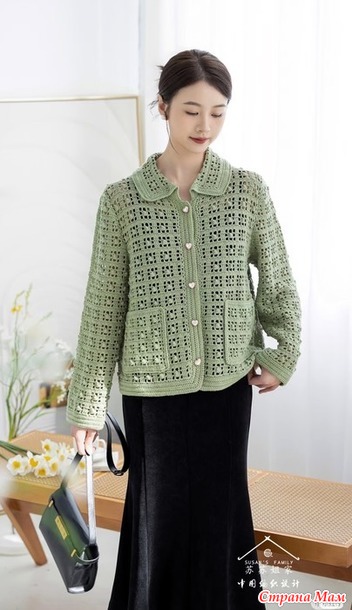 Ажурный жакет с отложным воротником и накладными карманами. Крючок.