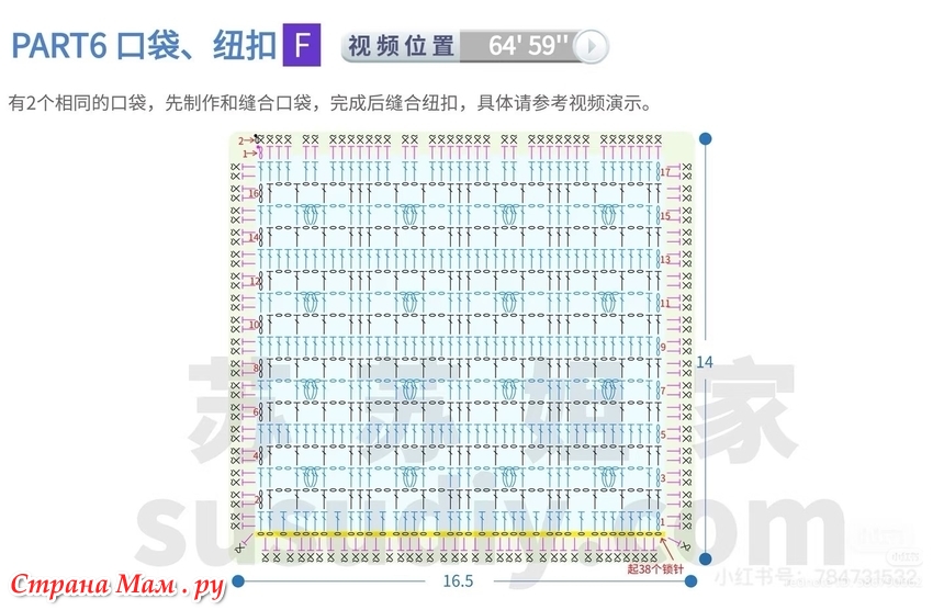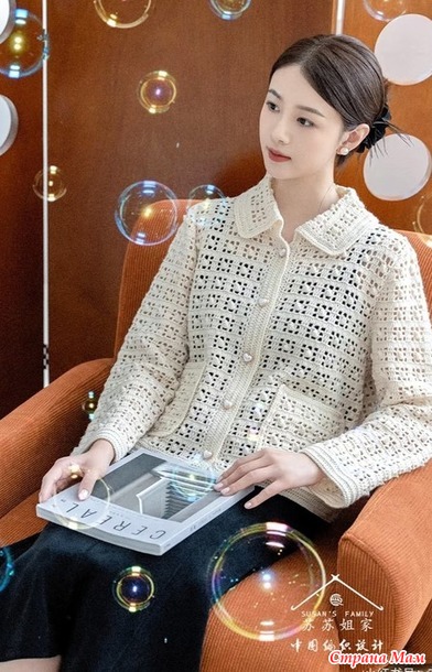 Этот жакет состоит из правой передней панели, левой передней панели, задней панели, рукавов, обвязанных крючком краев, карманов и пуговиц. Сначала свяжите крючком переднюю и заднюю панели и рукава. После этого соедините соответствующие участки. Затем обвяжите края. Наконец, сделайте и пришейте карманы и пришейте пуговицы.