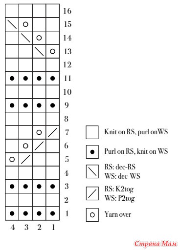 Вяжите 4 ряда, последний ряд — изнаночный. Следующий ряд (лицевая сторона): К1, начать с 12-го (12-го) 4-го (4-го) 12-й (4-й) 12-й рядов схемы и вязать 4-петли узора повторить 6 (7) 8 (8) 9 (10) 10 раз, k 1 (1) 1 (3) 1 (1) 3 рядов, M1R, k1 = 28 (32) 36 (38) 40 (44) 46 рядов.