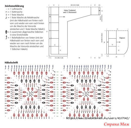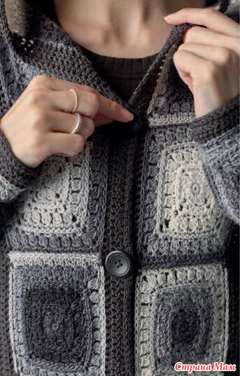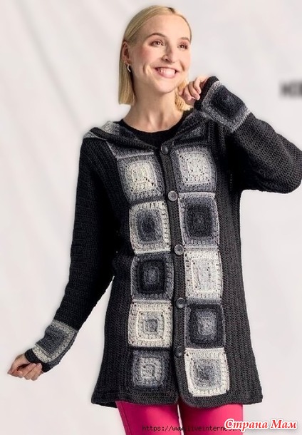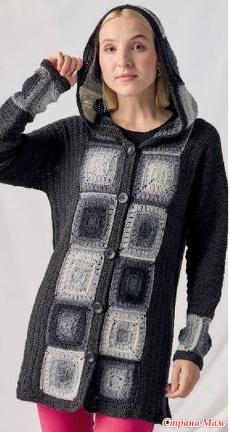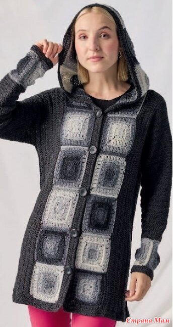 Свяжите капюшон крючком, как описано для бабушкиных квадратов. Для обвязки передних частей и капюшона свяжите 240 петель пряжей ME-RINO SILK SOCKS, а нижний край — 174 (190) 210 (244) петлями. В каждом переднем углу провяжите 3 столбика с накидом в одну петлю. В первом ряду провяжите столбики с накидом за заднюю стенку, затем провяжите 2 ряда по основному узору. Для петель на правой передней части провяжите 5 петель во втором ряду.
