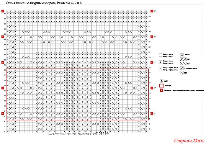 На схеме показан только ажурный узор центральной панели переда. При вязании прямыми рядами, схемы читать снизу вверх и справа налево в лиц.р. (нечетных) и слева направо в изн.р. (четных). При вязании круг.р. все ряды читать справа налево.