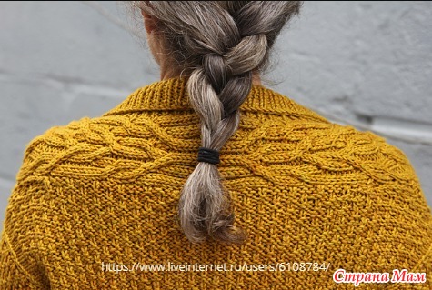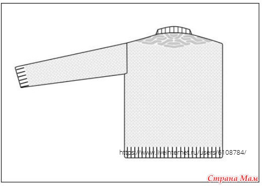 Это приблизительно 31.75 (34.25, 36.75, 39.5, 42, 44.5) (44.5, 47, 49.5, 49.5) см вокруг верхней части рукава (с припуском на шов примерно 1.25 см). При изменении окружности рукава обратите внимание, что количество петель должно быть кратно 4, плюс 1 в узоре, с дополнительной петлей в центре подмышки.