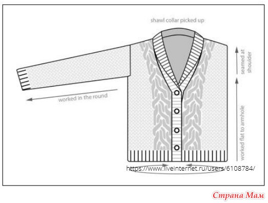 Рекомендуется использовать длинные круговые спицы для тела и планок для пуговиц, и предпочитаемые спицы для вязания небольших окружностей для рукавов.