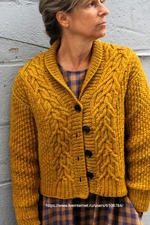 • Bee’s Knees связан прямо одной деталью снизу до пройм. Затем тело разделяют на 3 детали и вяжут отдельно до плечевых скосов. Воротник на каждой полочке продолжается вверх, как только петли плеча будут закрыты, и эти две части позже сшиваются внизу вокруг выреза горловины и в центре спины. Петли рукава поднимают вокруг сшитых пройм и рукав вяжут по кругу до манжеты. Планку для пуговиц поднимают вдоль передней части кардигана и вяжут прямо, с формированием укороченными рядами для создания сложенного шалевого воротника.