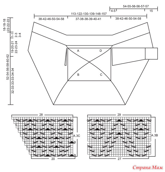Вяжите вкруговую по следующей схеме: узор A.1 (= 4 п.), узор A.2 (= 4 п.), узор A.1 (= 4 п.) и узор A.2 (= 4 п.). Продолжайте работу по этой схеме и делайте прибавки, как указано на схемах узоров. Когда провяжете полный раппорт узора A.2, петли между маркерами B и C и между маркерами D и A вяжите следующим образом. Провяжите узор A.3A (= 21 п.), узор A.3B (= 27 п.) и A.3C (= 20 п.). Когда провяжете полный раппорт узора A.3, узор A.1 тоже будет закончен, и у вас должно быть 308 петель для всех размеров (67 петель между маркерами A и B и между маркерами C и D, 85 петель между маркерами B и C и между D и A, и 4 угловые петли).