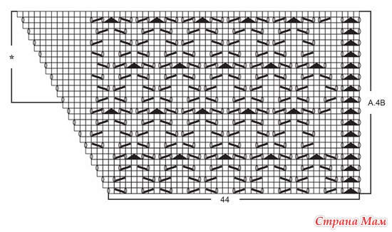 С изнаночного ряда вяжите эти петли лицевой гладью поворотными рядами, петли между маркерами В и С вяжите по схемам A.4A и A.4B, выполняйте прибавки с каждой стороны от 2 угловых петель (в каждом лицевом ряду). Провяжите таким образом 7 рядов после убавок пройм, последний ряд должен быть изнаночным. Обрежьте нить. Примечание: ажурный узор A.4 вяжите, как указано на схеме, повторяйте раппорт к низу спинки до конца работы, при этом количество петель узора не будет меняться, но петель лицевой глади со стороны угловых петель будет становиться больше.