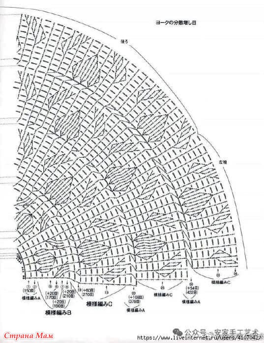 Основная часть: Разделите кокетку на переднюю и заднюю части тела, а также рукава. Наберите петли с 8-й петли кокетки и клина и свяжите переднюю и заднюю части тела узором А и С. Продолжайте вязать.