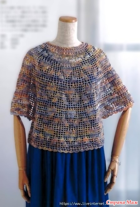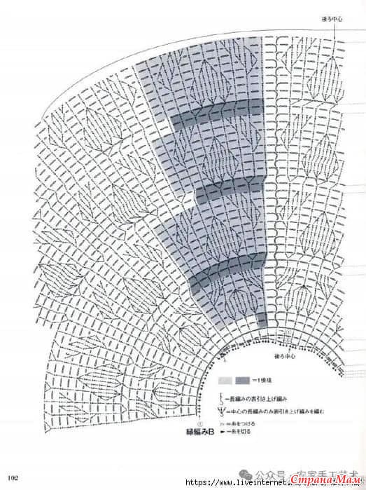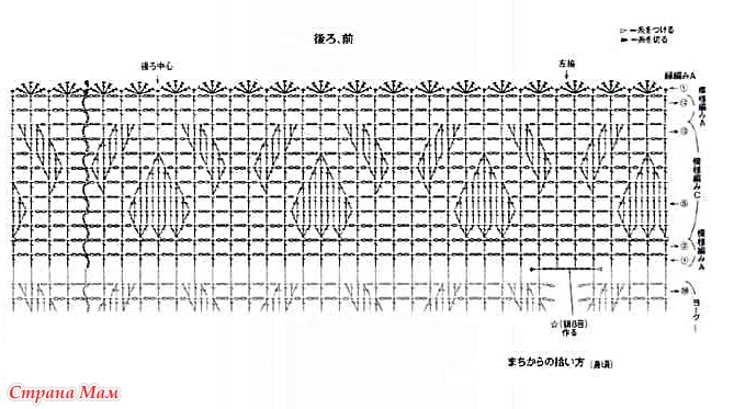 Наберите петли из набранной цепочки и, ориентируясь на схему, провяжите узорчатым узором вырез горловины сзади, создавая разницу между передней и задней частью изделия.