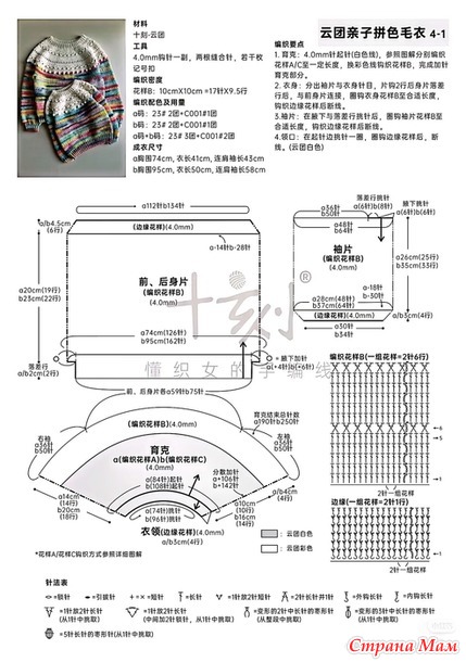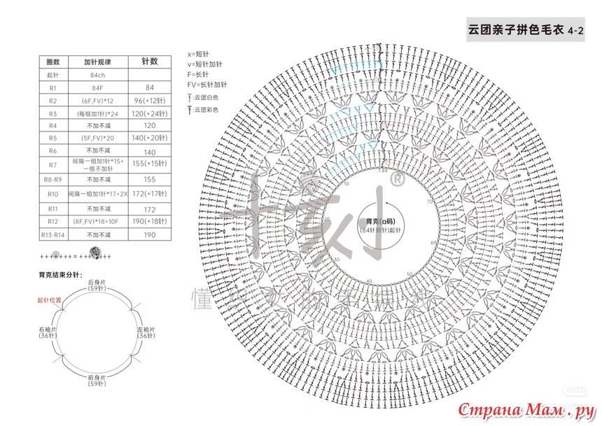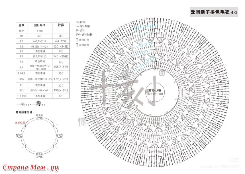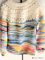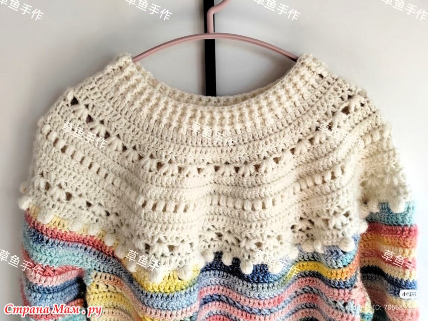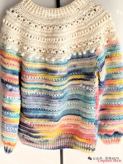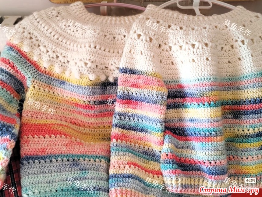 Пуловер с однотонной круглой кокеткой и подолом из секционной пряжи для родителей и детей. Крючок.