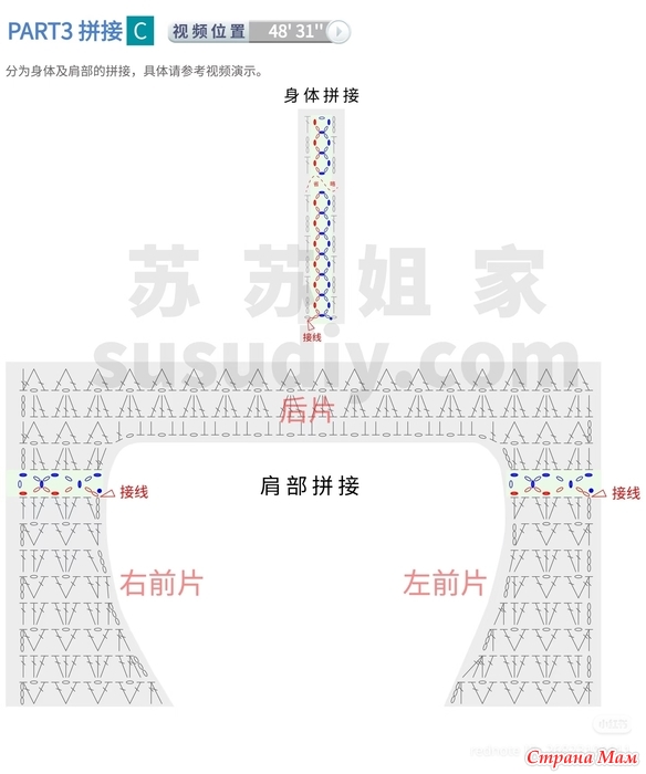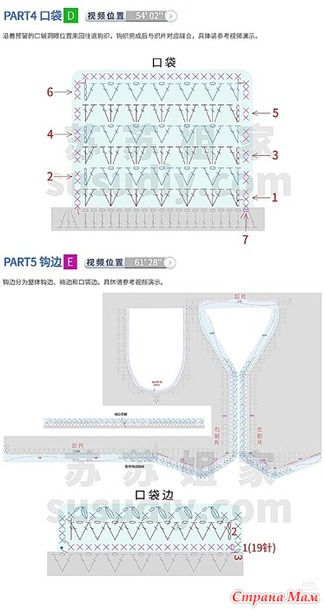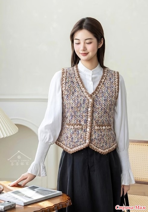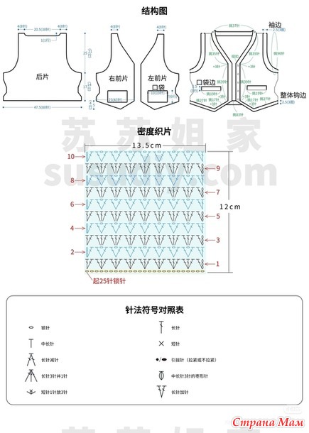 Этот жилет состоит из спинки, левой и правой передних частей, вставок, карманов, обвязанных крючком краев, пояса сзади и пуговиц. Сначала свяжите переднюю и заднюю части отдельно. После завершения соедините переднюю и заднюю части вместе в соответствующих местах. Затем последовательно свяжите карманы, обвязанные крючком края и пояс сзади. Наконец, пришейте пуговицы.
