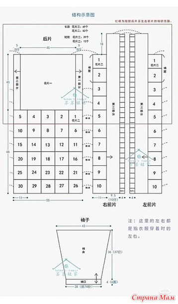 Этот кардиган состоит из спинки, левой и правой передних частей, рукавов, планки и вязаного края. Сначала отдельно свяжите спинку, левую и правую передние части и рукава. Затем соедините рукава. Наконец, свяжите планку и вязаный край. Для получения информации о необходимых инструментах, пряже и цветовой гамме, пожалуйста, обратитесь к бумажной выкройке.