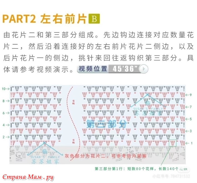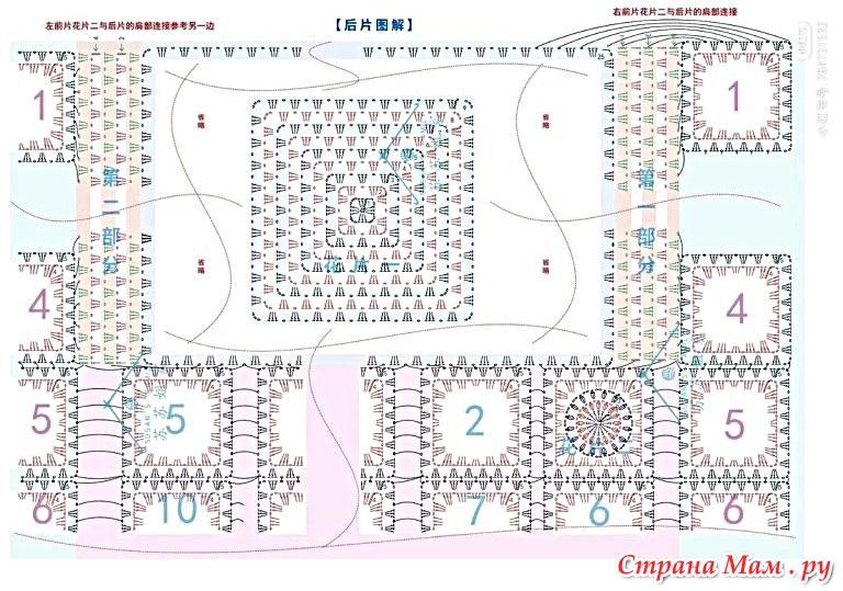 Изделие состоит из двух частей: второй и третьей. Сначала свяжите и соедините соответствующее количество частей второй части. Затем, вдоль сторон соединенных передней части второй части и стороны задней части первой части, наберите петли и провяжите третью часть туда и обратно.