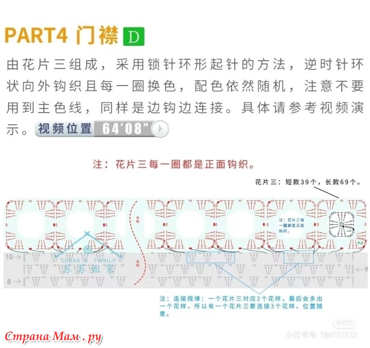 Вязание состоит из трех цветочных мотивов, начинающихся с воздушной петли, вяжутся по кругу против часовой стрелки, меняя цвет в каждом ряду. Цветовая гамма остается случайной; избегайте использования пряжи основного цвета. Соединяйте мотивы по мере вязания. Подробности смотрите в видеодемонстрации. [Местоположение видео]