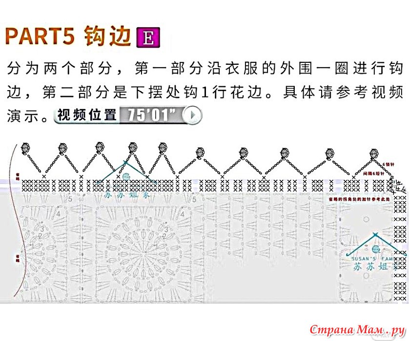 Процесс состоит из двух частей. Первая часть — это вязание крючком внешнего края изделия, а вторая — вязание крючком одного ряда кружева по низу. Подробности смотрите в видеодемонстрации.