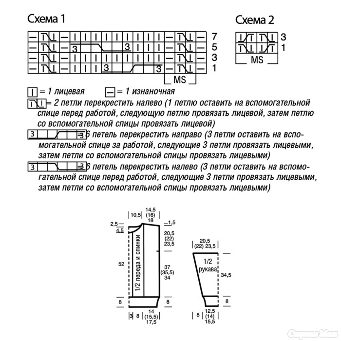Узор из «Кос» (на 17 петель). Вязать согл. схеме 1. На ней даны лицевые ряды.