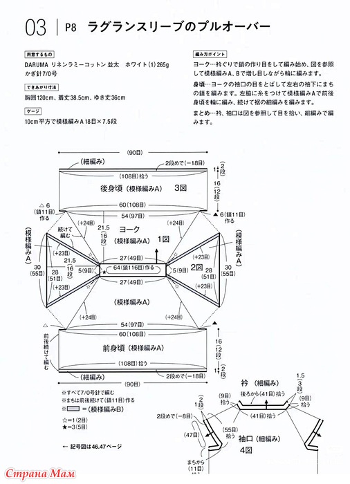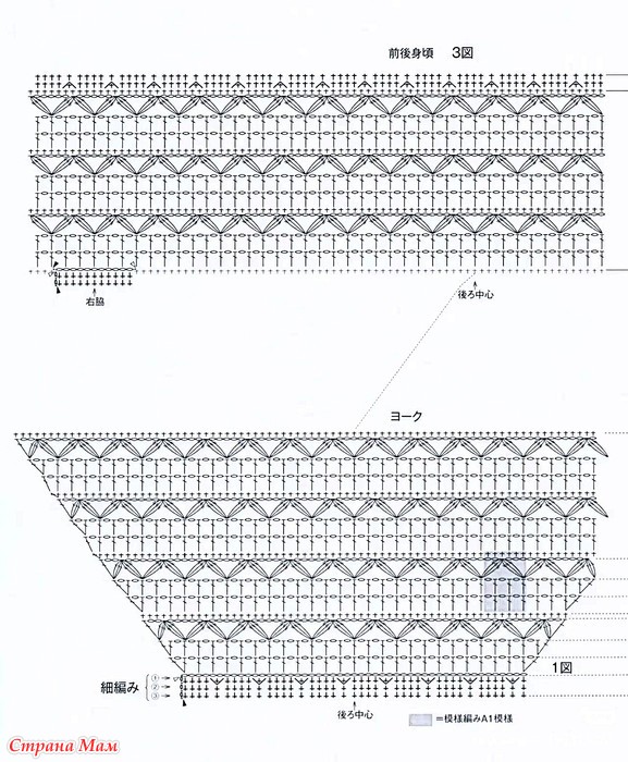 Основная часть: Пропустите петли на манжетах кокетки и свяжите цепочку клиньев под левым и правым рукавами. Присоедините нить к левой стороне и провяжите узор А по кругу спереди и сзади основной части, затем продолжайте вязать столбики без накида по низу изделия.