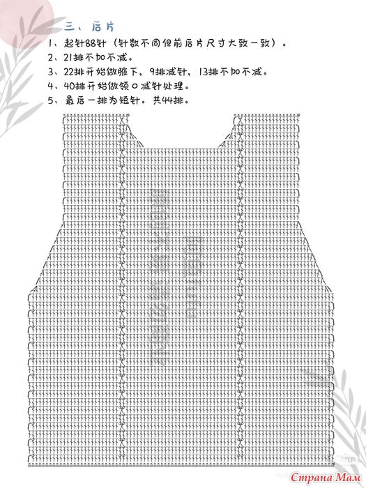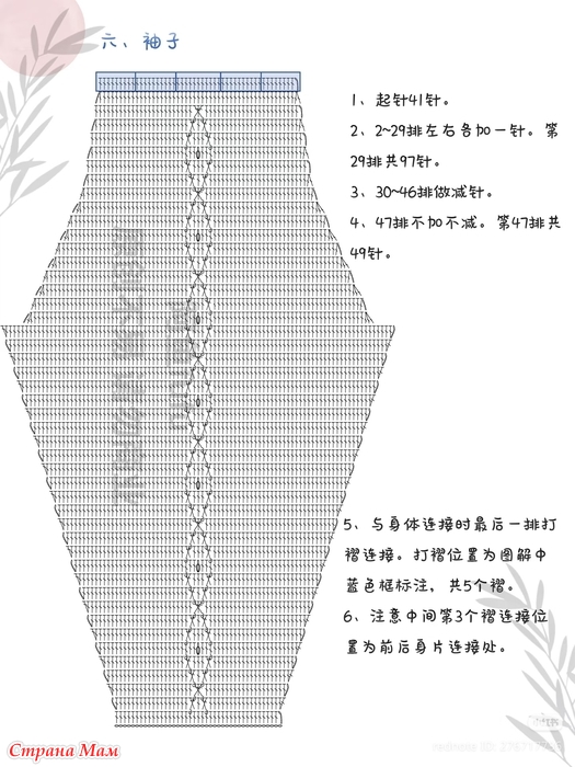 3. Начинайте вязать подмышечную область с 22-го ряда, убавляйте петли с 9-го ряда и не увеличивайте и не убавляйте петли с 13-го ряда.