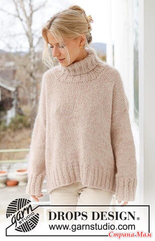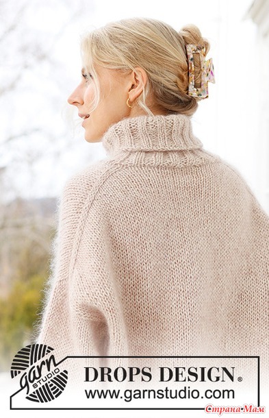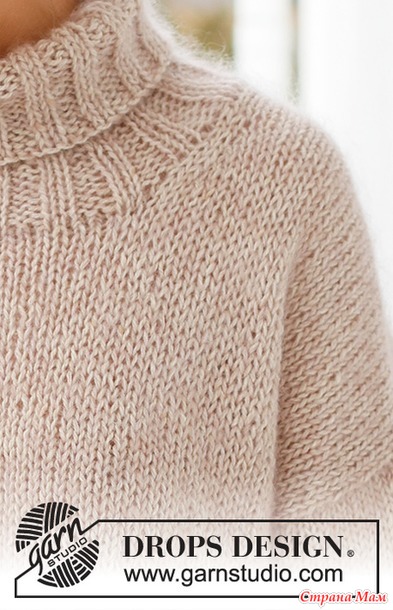 Свитер связан в 3 нити пряжи DROPS Soft Tweed (1 нить) и DROPS Kid-Silk (2 нити) сверху вниз лицевой гладью с диагональным плечом и высоким воротником.