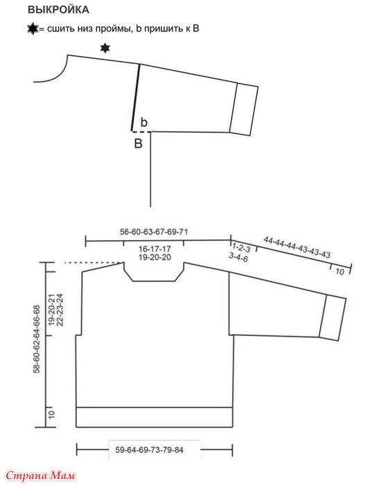 Длина свитера – ок. 58-60-62-64-66-68 см от верхней точки плеча.