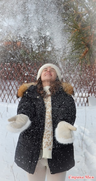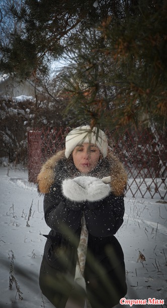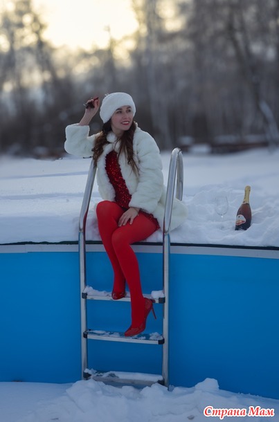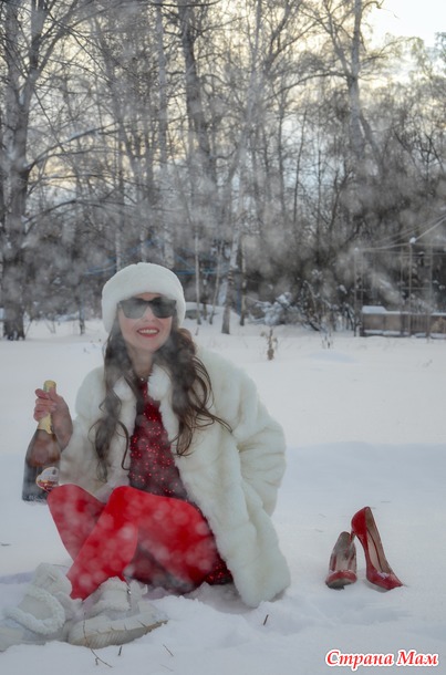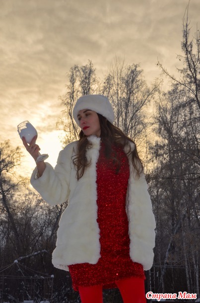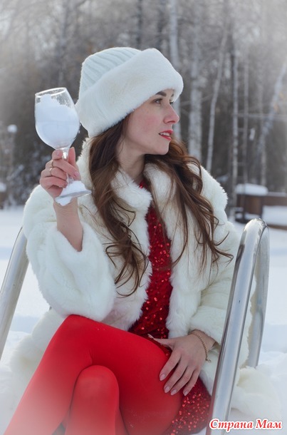 Идея с бокалом снега моя , потому что вино побоялись открывать, да оно и не красное . Я тоже посчитала , что красное с цветом помады бы сочеталось , ну раз нет, то белый снег с шапочкой и шубкой в сочетании
