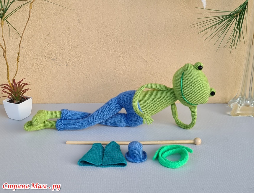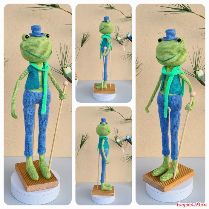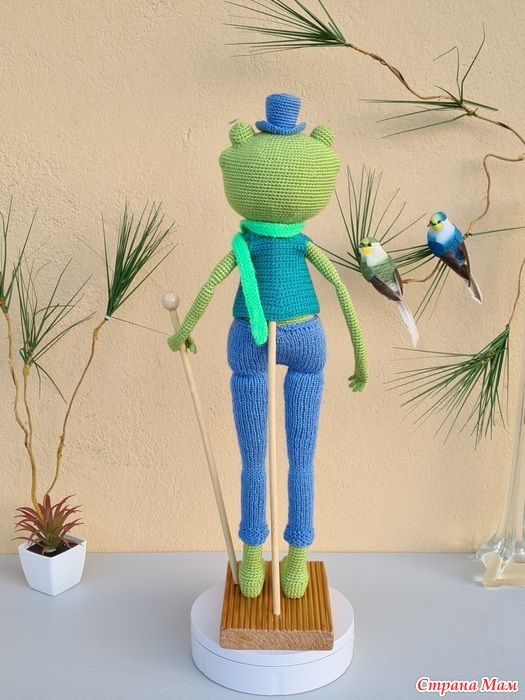 Лягушка может сидеть (только с опорой). Верхние лапы прикреплены к каркасу, так что ее можно поставить в разные позы. К сожалению, она не может стоять самостоятельно, но чтобы она могла стоять, я сделал для нее деревянную подставку.