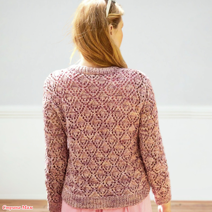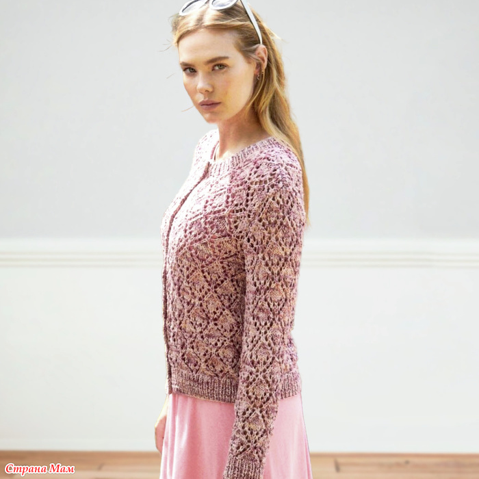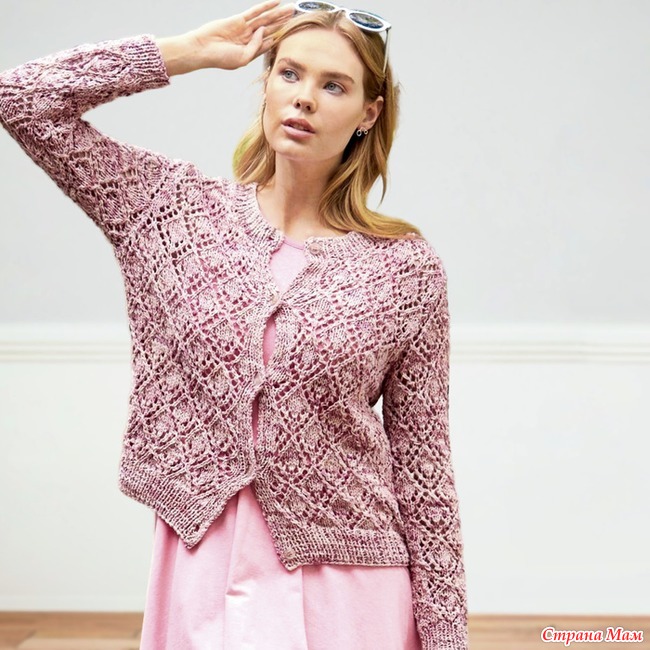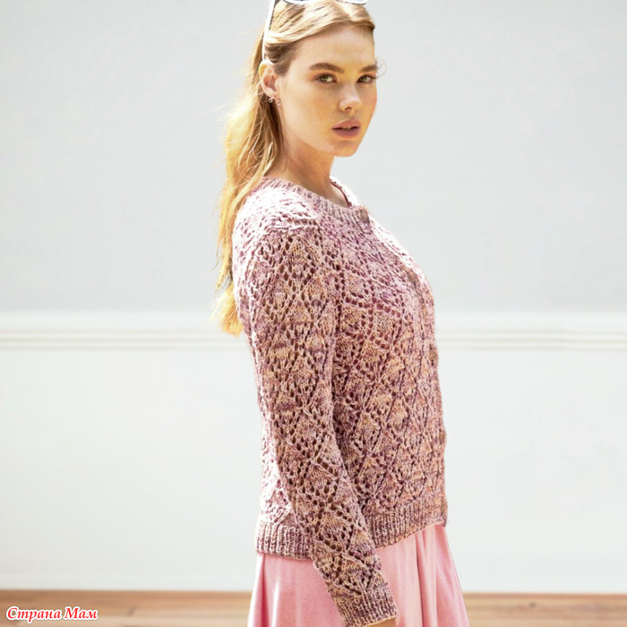 Для вязания нам понадобится 500 (600) 700 г пастельно-розовой меланжевой пряжи: 100% шёлк; 165 м/50 г. Спицы № 5 и круговые спицы № 5. А также 5 пуговиц диаметром 16 мм.