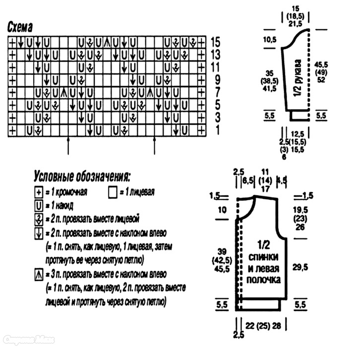 Узор 2. Ажурный узор (число петель кратно 10 + 1+2 кромочные). Вязать по схеме. На ней даны только лицевые ряды; в изнаночных рядах петли и накиды провязывать изнаночными. Начать с петель перед правой стрелкой, постоянно повторять раппорт из 10 п. между стрелками и закончить петлями после левой стрелки. Постоянно повторять 1-16-й р. При выполнении убавок и прибавок следить за тем, чтобы число накидов и про-вязанных вместе петель внутри ряда постоянно совпадало.