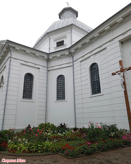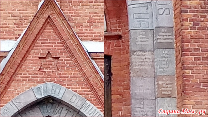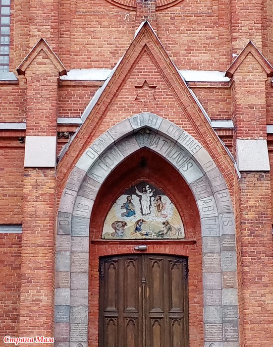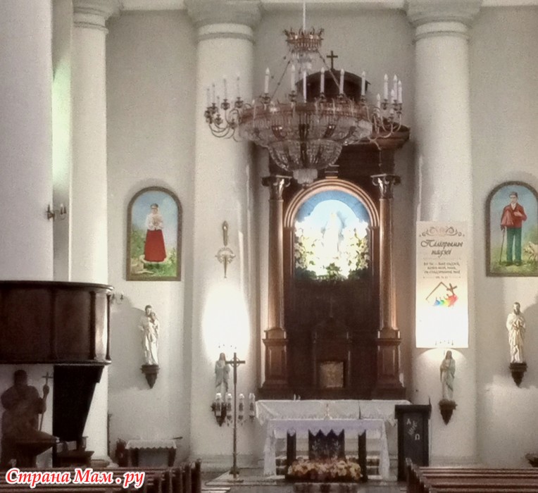 Имена пожертвовавших на храм выгравированы на плитах,но прочитать их сейчас невозможно. Все надписи уничтожены. Когда и почему — неизвестно. Согласно одной из легенд, приказ сделать так отдал местный чиновник. Ему не понравилось, что имена обычных людей разместили на фасаде, а табличку с благодарностью царю — на задней части костела. По другой версии, имена замазали уже в советское время.