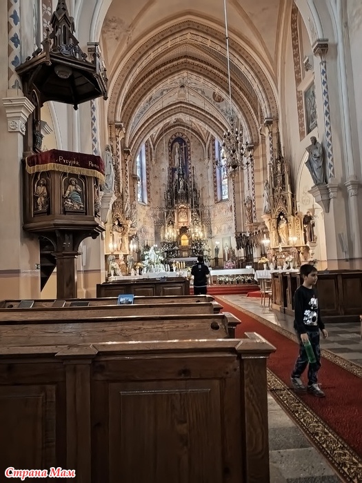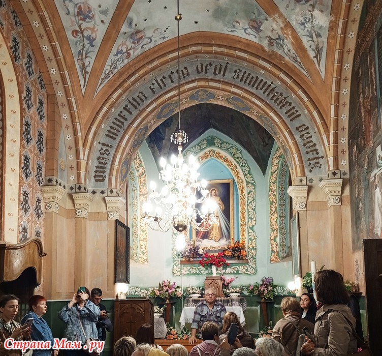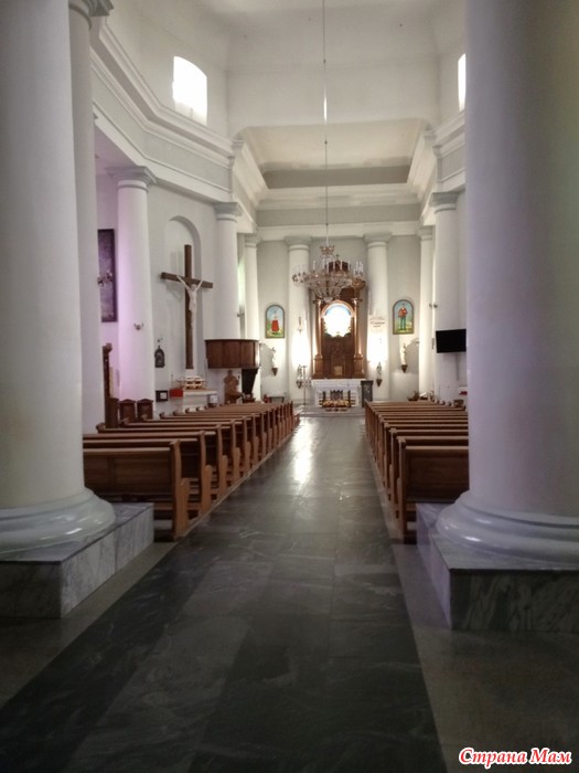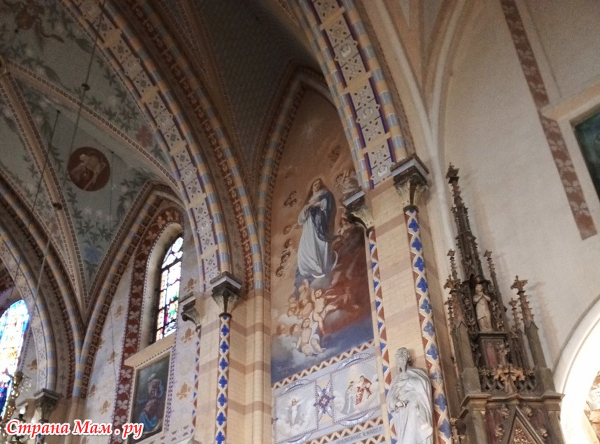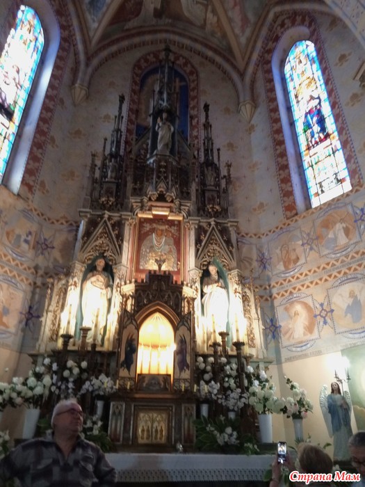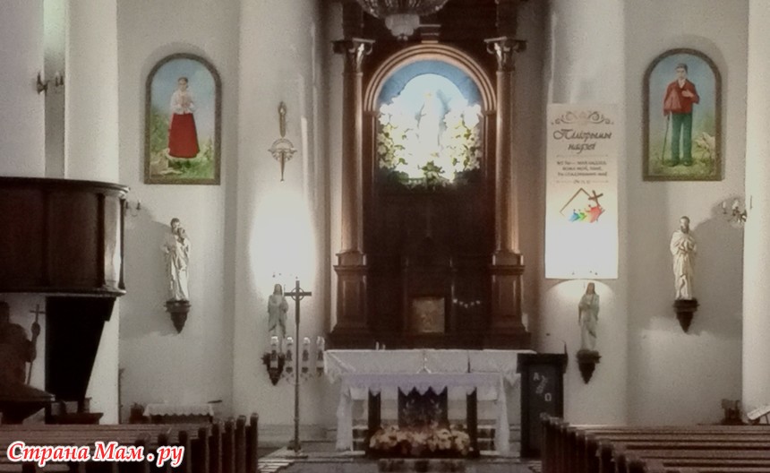 Интерьер поражает. Витражи, фрески, скульптура, чеканка, резьба по дереву, керамика создают высокохудожественную среду храма.