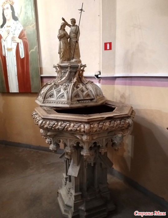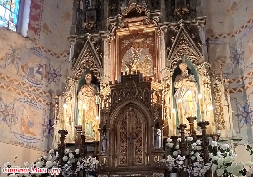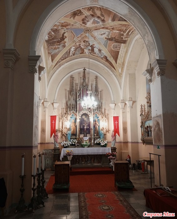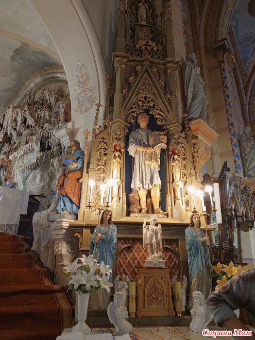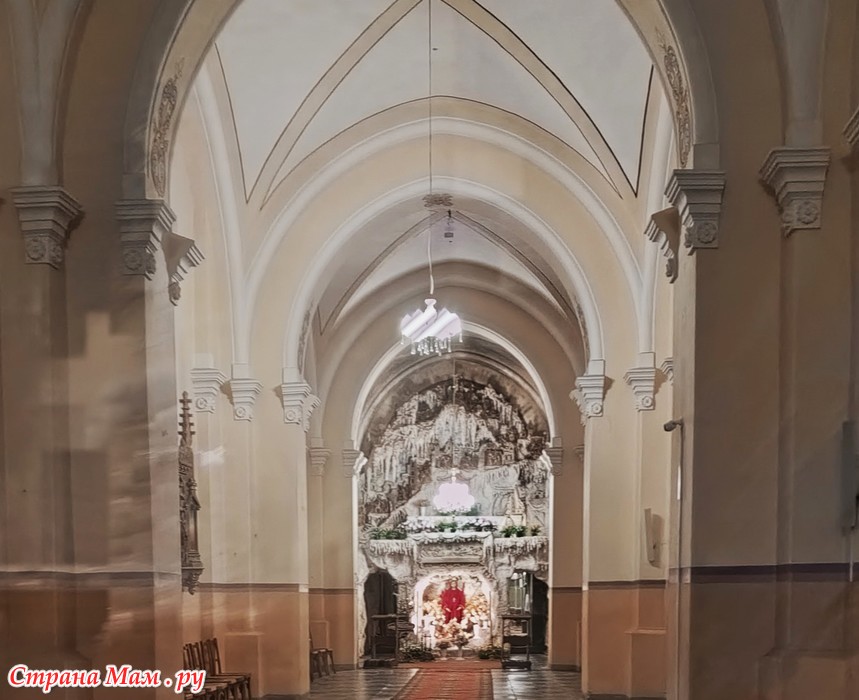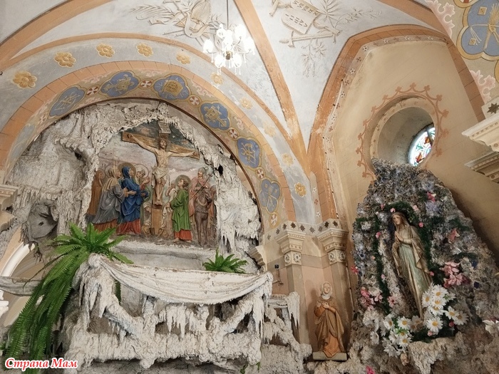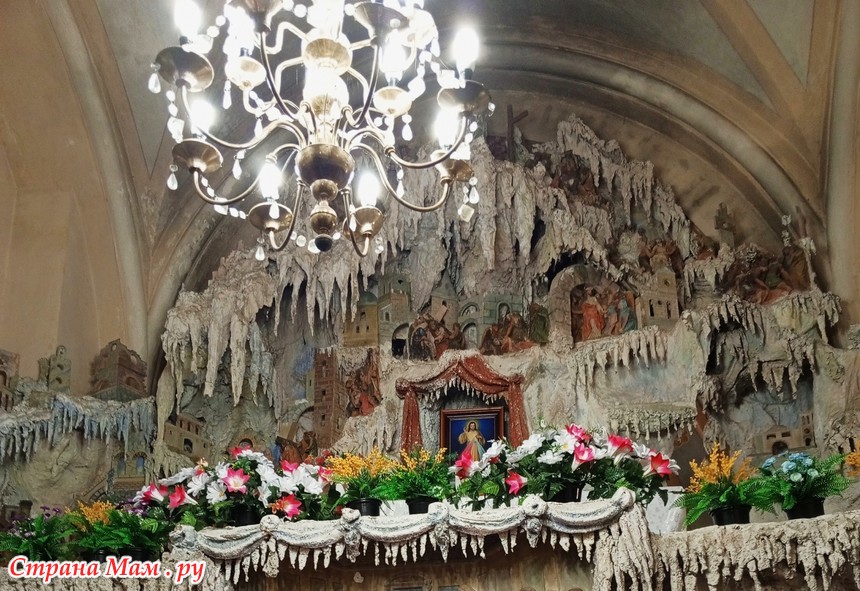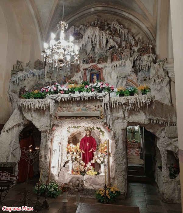 Слева от алтаря, из гипса искусственно создана конструкция в форме горы, имеющей таинственный проход как будто бы в пещеру. Таких пещер нет больше нигде в Беларуси.