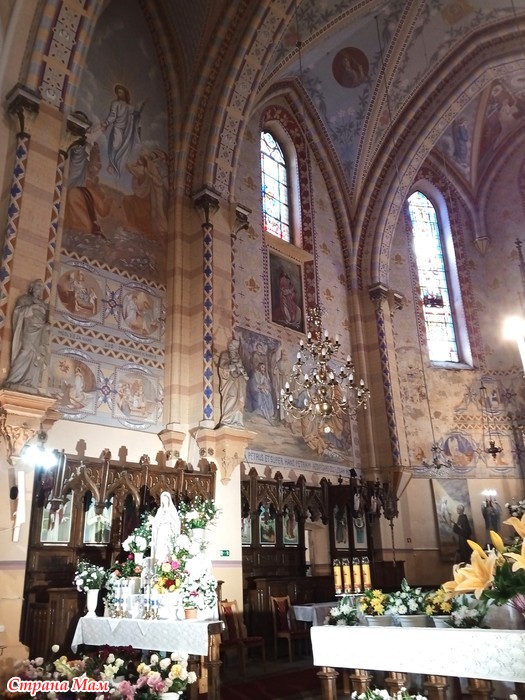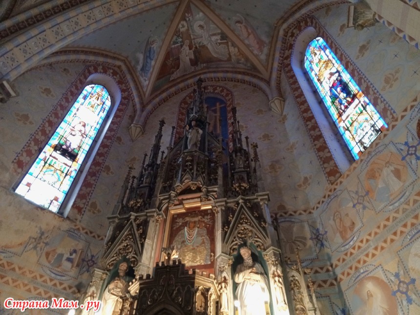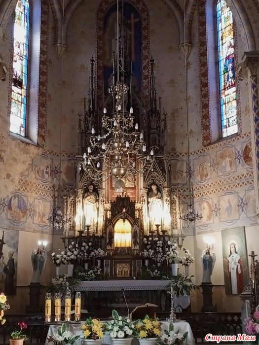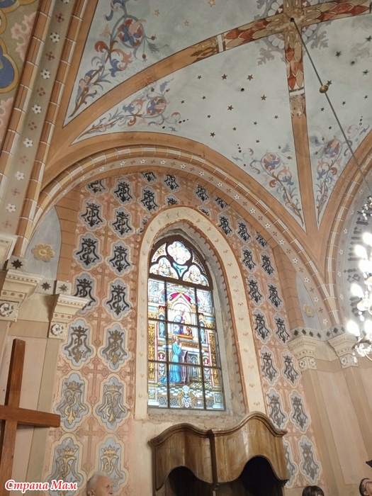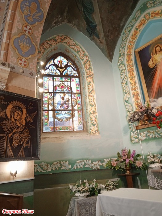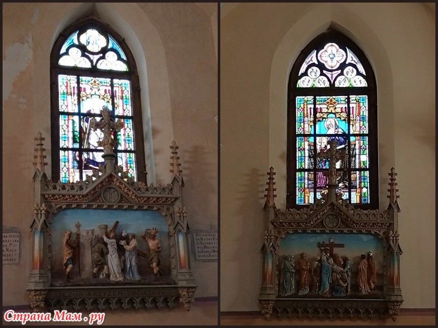 На боковых барельефных картинах-панно и оконных витражах изображён Крестный путь Христа.
