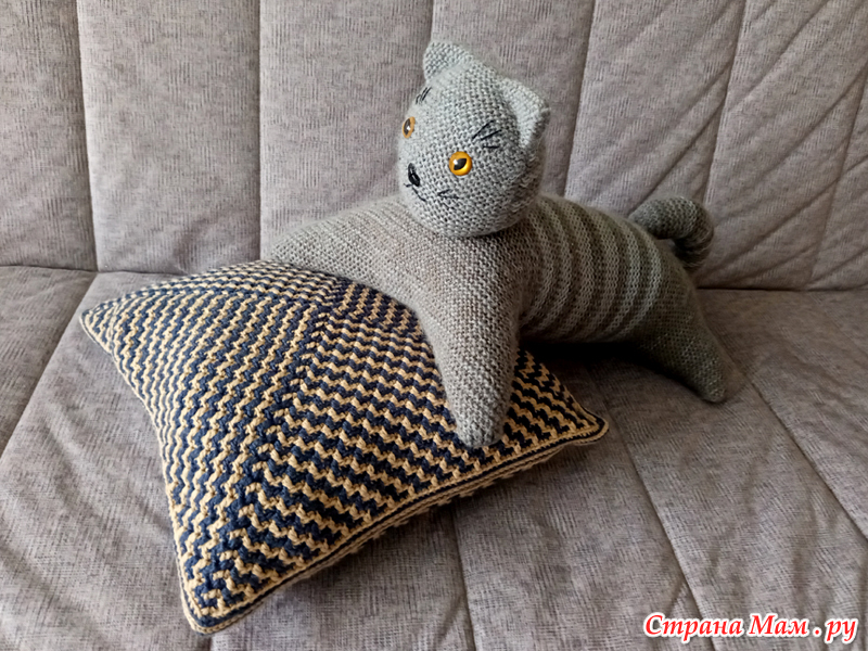 Материалы: пряжа «Детская новинка», 100% акрил, 200 м/50 г, вязала в 2 нити. Для внутренней подушки ткань типа джинс, холофайбер.