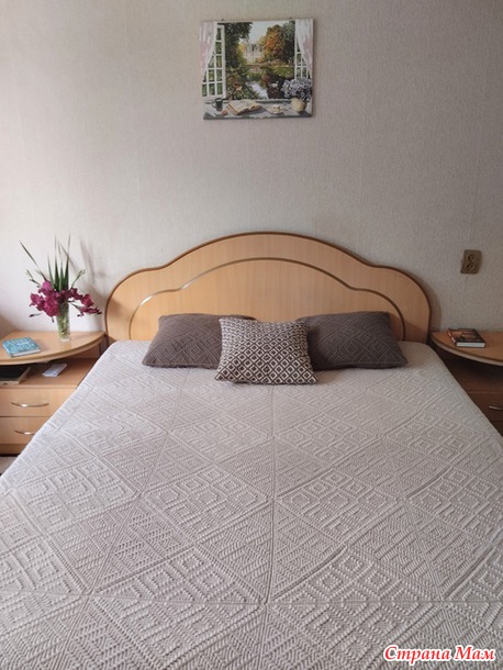 Уже давненько я связала светлое покрывало на кровать. Виделось оно мне с в комплекте с тремя подушками – две из той же пряжи, но коричневого цвета, связанные тем же рисунком, а третья –сочетание обоих используемых цветов.