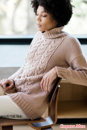 Узор косы провязан только на переде. Плечевые швы либо сшиваются традиционно, либо вы можете сшить их так, чтобы они были видны снаружи. После сборки поднимают петли по краю горловины и вяжут ворот по кругу.