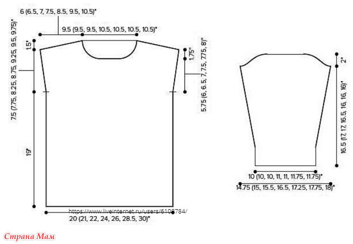 Продолжать по рисунку на длину проймы 5.75 (6, 6.5, 7, 75, 775, 8) дюймов от маркеров проймы, или на 12 рядов меньше чем на спинке до начала плеча, заканчивая в изн. ряду.