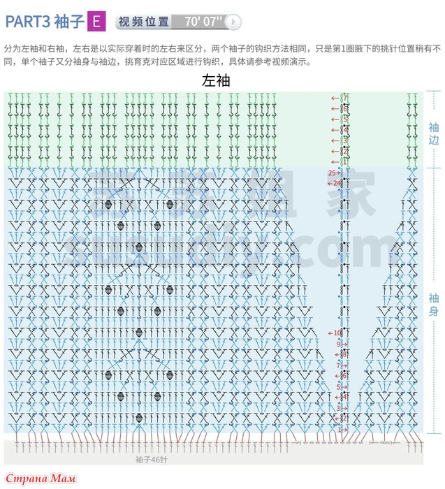 Изделие делится на левый и правый рукава. Левый и правый рукава различаются по форме при ношении. Оба рукава вяжутся одинаково, за исключением того, что расположение петель, набранных подмышкой в ​​первом ряду, немного отличается. Каждый рукав делится на основную часть и край. Наберите петли в соответствующей области кокетки и свяжите их. Подробности смотрите в видеодемонстрации.