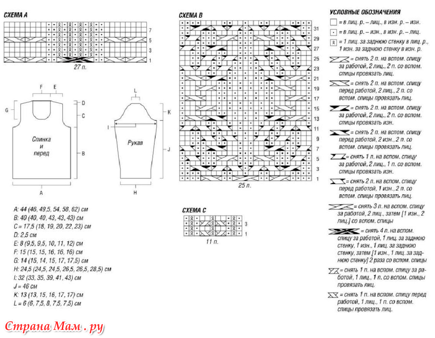 Плотность вязания: жемчужный узор, спицы № 4: 20 п. и 30 р. = 10 х 10 см; узор по схеме В = 9 см в ширину.