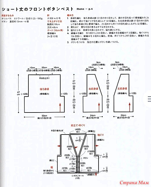 1. Свяжите основную часть изделия. Для спинки наберите 121 воздушную петлю, поднимите половину воздушной петли и провяжите 24 ряда узорчатым лицевым гладью. Продолжите, убавляя петли в области проймы и провяжите 32 ряда лицевыми гладями. Для левой и правой передней части изделия наберите 57 воздушных петель и провяжите так же, как и спинку, затем, начиная с 25-го ряда, убавьте петли в области горловины и провяжите 32 ряда лицевыми гладями.