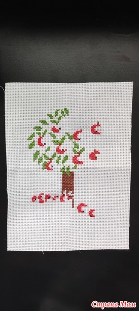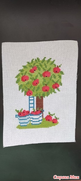 Особенности работы: в схеме 9 цветов, но в процессе стало ясно, что на крону светло-зеленого не хватит и похожий цвет я нашла в своей палитре. Ещё не хватало синего и розового, их тоже взяли из набора ниток, который пришлось купить на маркетплейсе (100 цветов, синтетика).